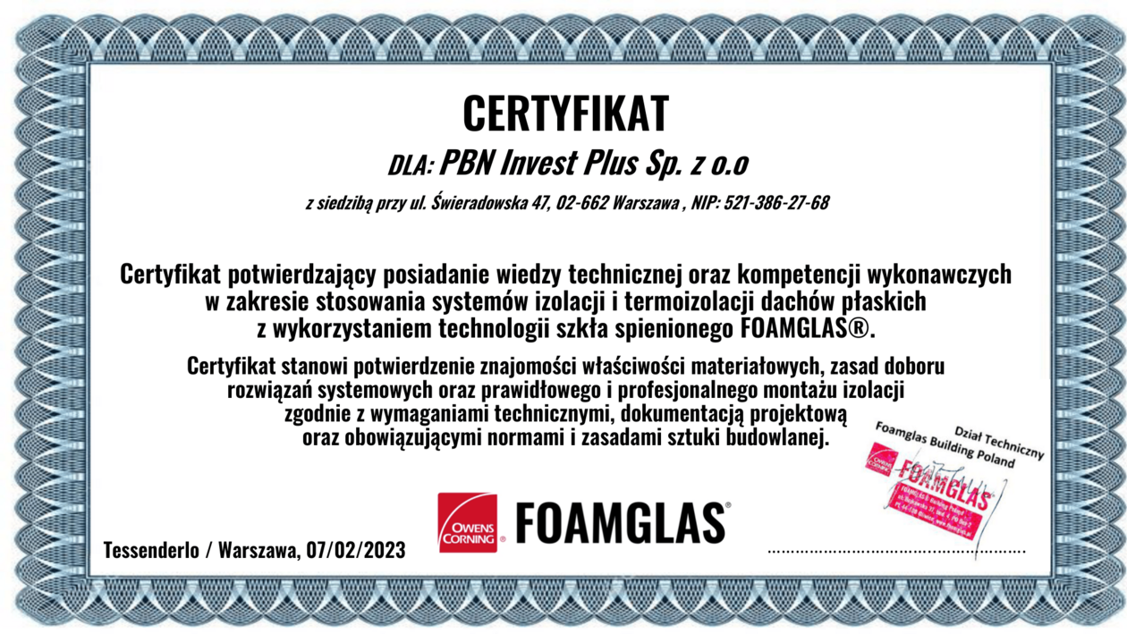 Certyfikat Foamglas potwierdza, że firma PBN Invest Plus Sp. z o.o. posiada kwalifikacje do stosowania specjalistycznych systemów izolacji dachów płaskich opartych na technologii szkła spienionego FOAMGLAS®. Dokument stanowi dowód ukończenia szkolenia technicznego oraz znajomości zasad prawidłowego montażu i doboru rozwiązań systemowych.